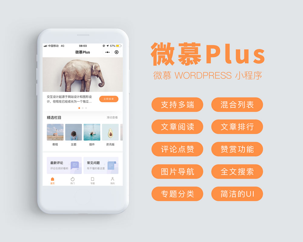 微慕WordPress小程序增强版是在开源版基础上重新架构、设计、优化过的WordPress小程序,性能和用户体验更佳,同时打通微信小程序、QQ小程序、百度小程序、支付宝小程序、字节跳动小程序(包括今日头条,抖音,西瓜视频等字节跳动app)等,是实现一站多端的小程序解决方案。
